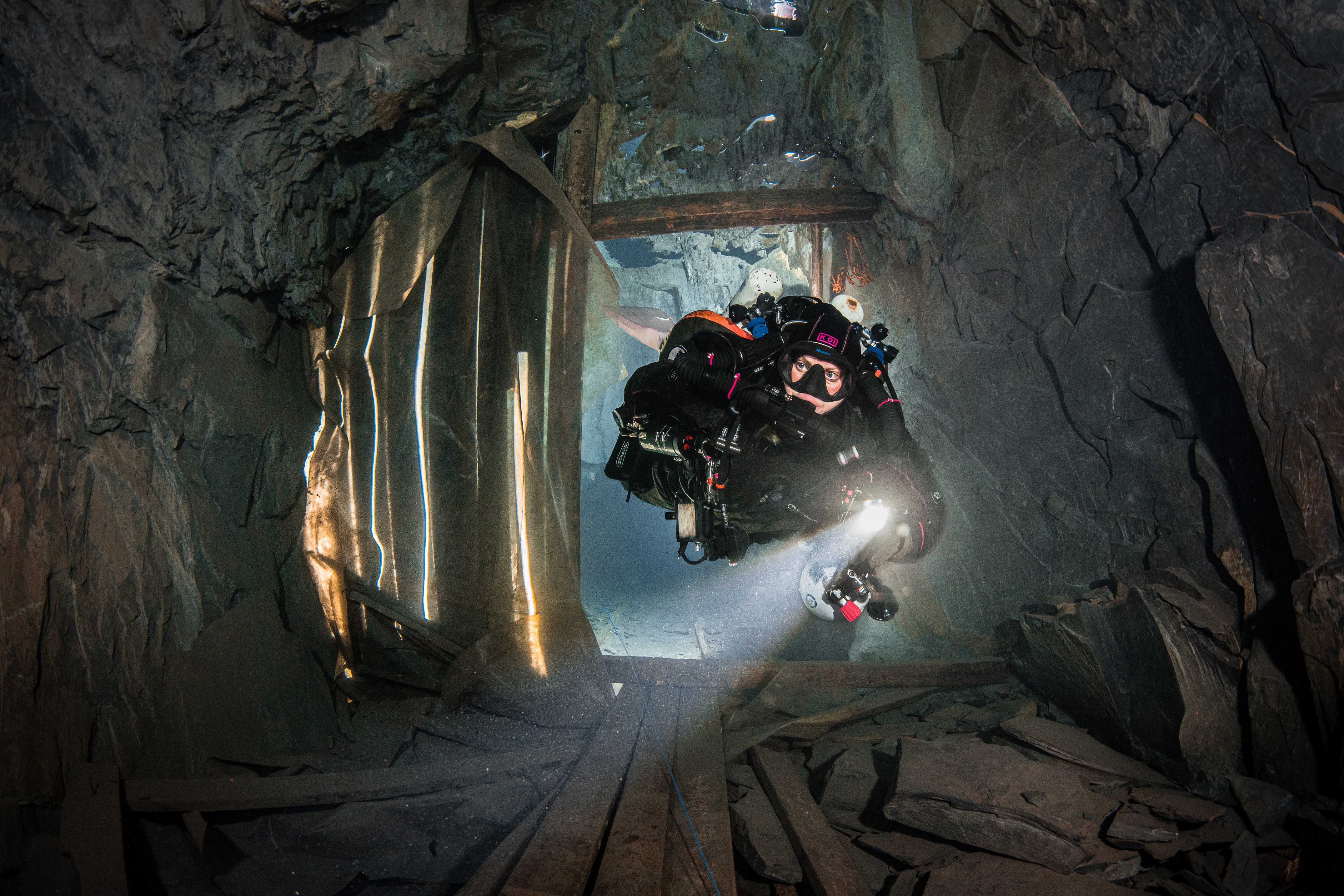 Foto 2: Alexandra Pischyna taucht im ehemaligen Schieferbergwerk Felicitas im Sauerland. © Julian Mühlinghaus