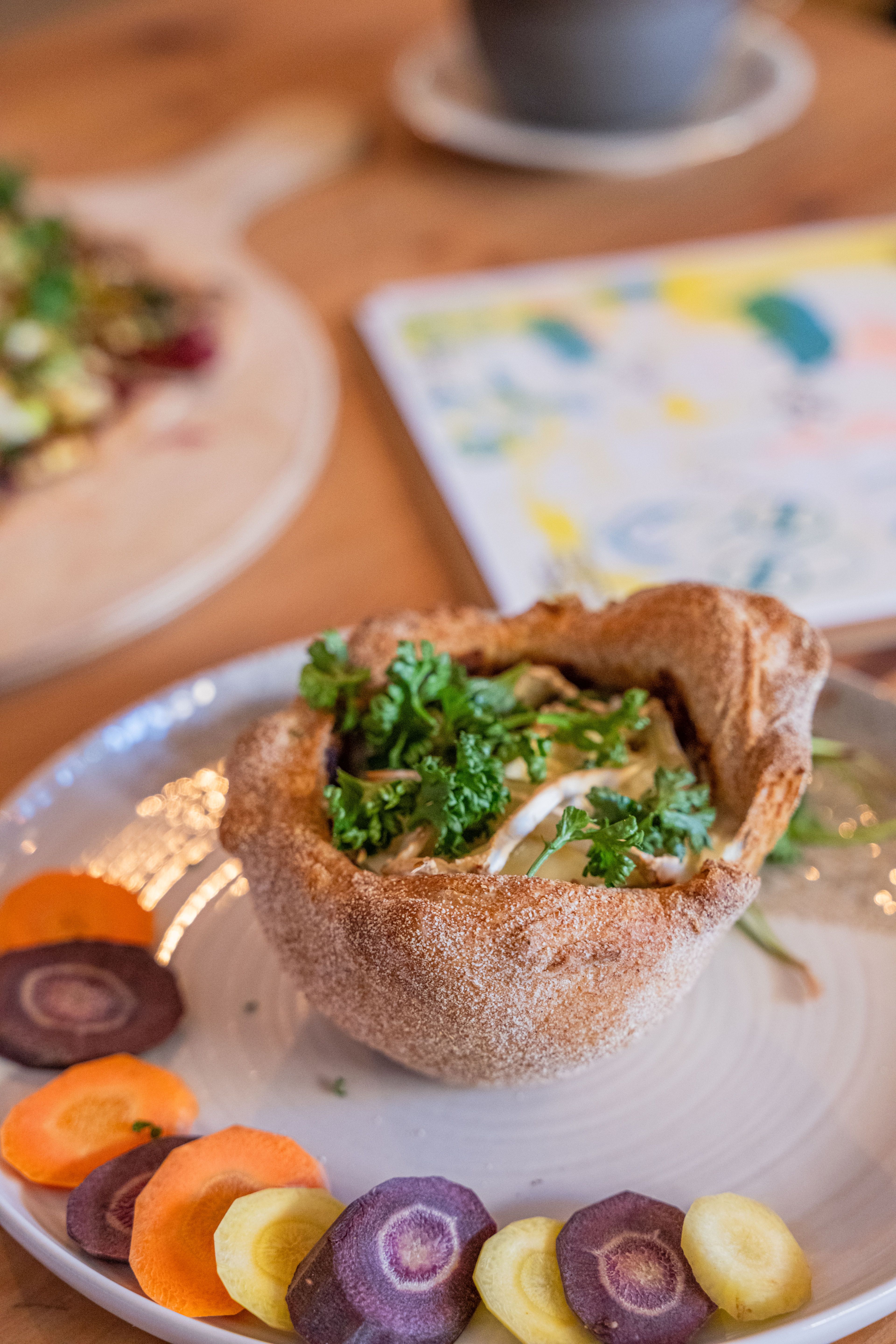 Mit dem Umzug ins WERK. konnte das findus wachsen und sich weiterentwickeln. Seit der Eröffnung im März 2025 bietet das Café nun mehr Raum für Gäste, Kulturveranstaltungen und handwerklich hergestellte Lebensmittel. Bio-zertifiziert und vegetarisch war das findus schon immer, nicht als Marketingstrategie, sondern weil es den Werten der Gründer:innen entspricht. Doch ihr Verständnis von Nachhaltigkeit geht weit über die Küche hinaus. Es zeigt sich in jedem Detail des Cafés: Einige Möbel stammen aus der Auflösung des ehemaligen Karstadt-Kaufhauses, aus alten Beständen des Finanzamts oder privaten Spenden. Statt auf Neues zu setzen, geben Fiona und Christian bestehenden Dingen eine zweite Chance – ein bewusster Gegenentwurf zur Wegwerfgesellschaft. Doch das findus ist auch ein sozialer Treffpunkt, an dem regelmäßig Veranstaltungen stattfinden – von Tauschabenden, über Musikevents bis hin zu Backworkshops. „Wir wollen nicht nur Essen servieren, sondern ein Lebensgefühl vermitteln“, sagt Fiona. „Ein Wohnzimmer, in dem man sich wohlfühlt, Neues entdecken kann und in Kontakt mit anderen Menschen kommt.“