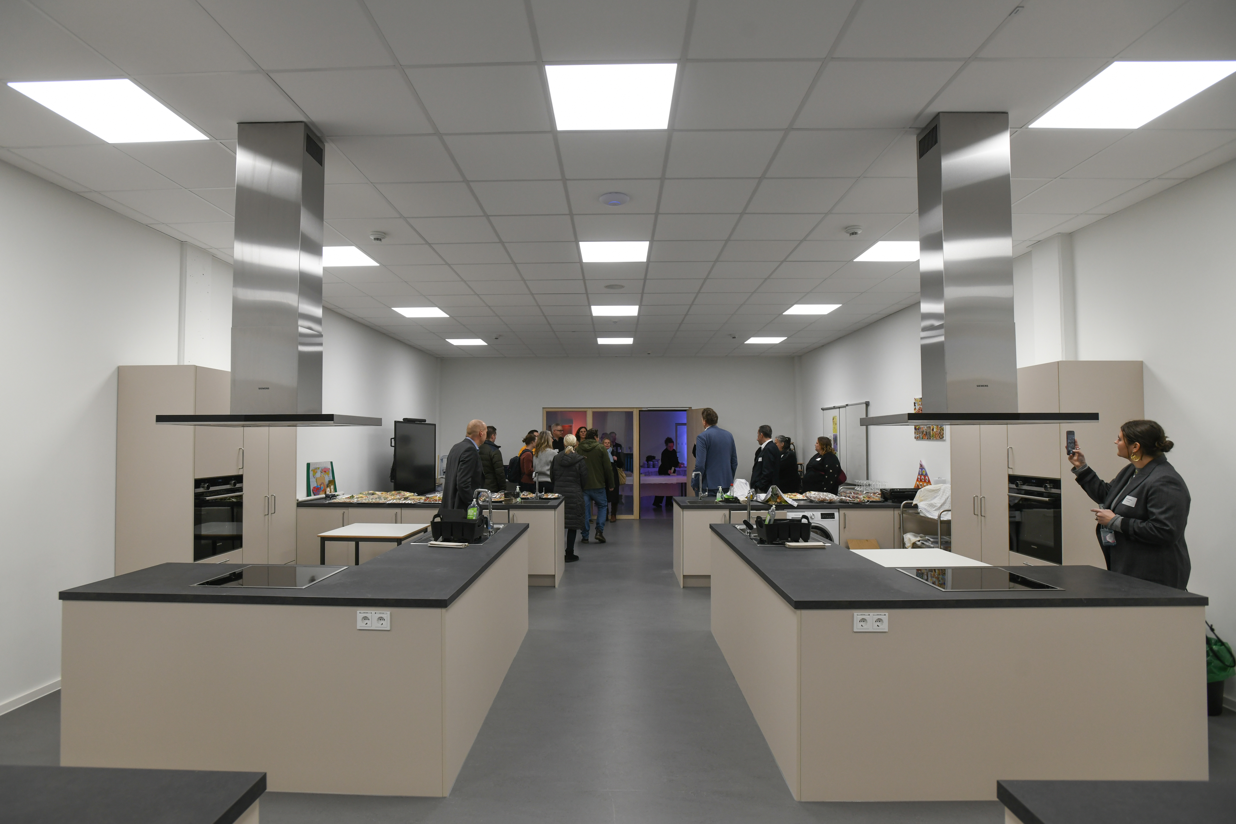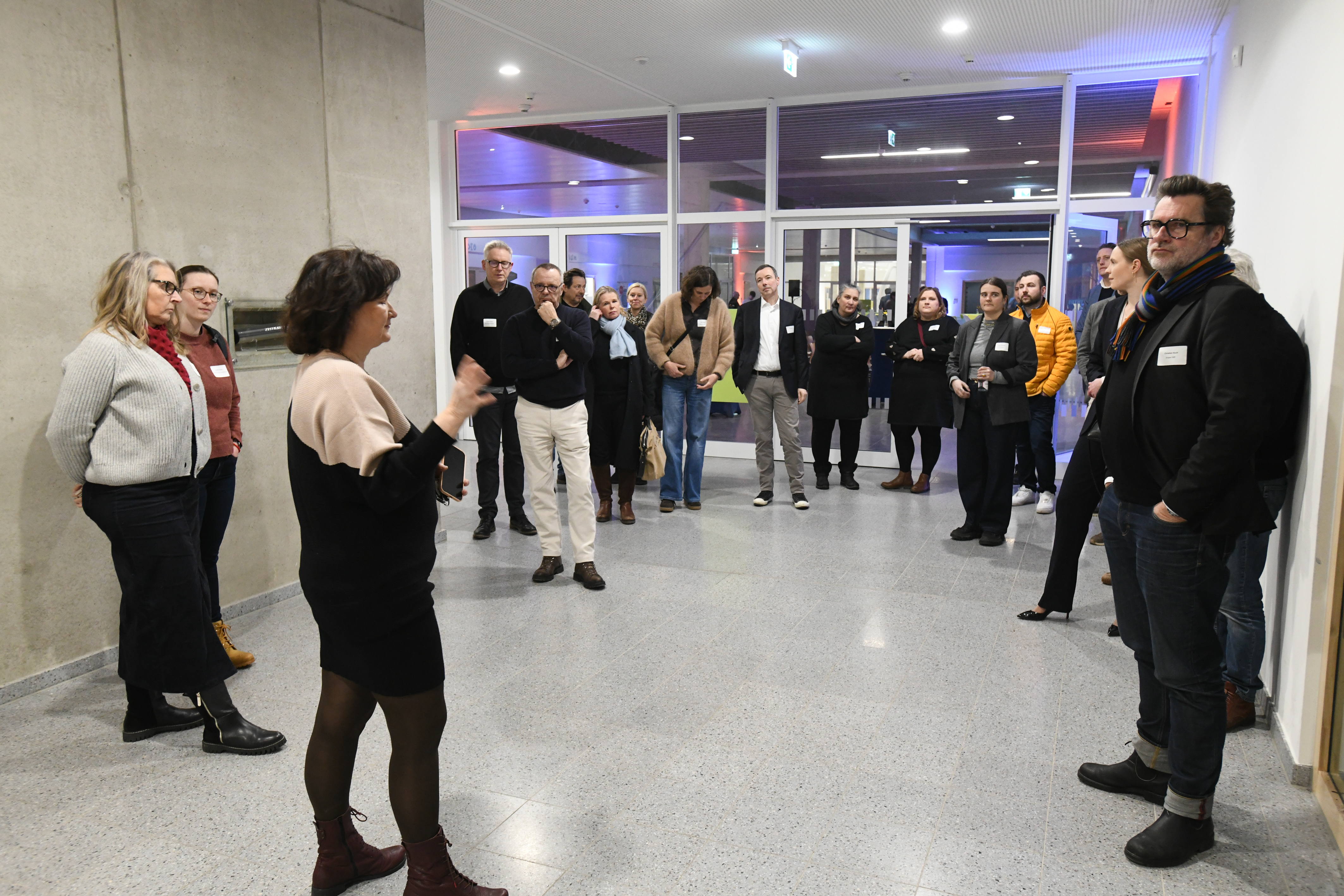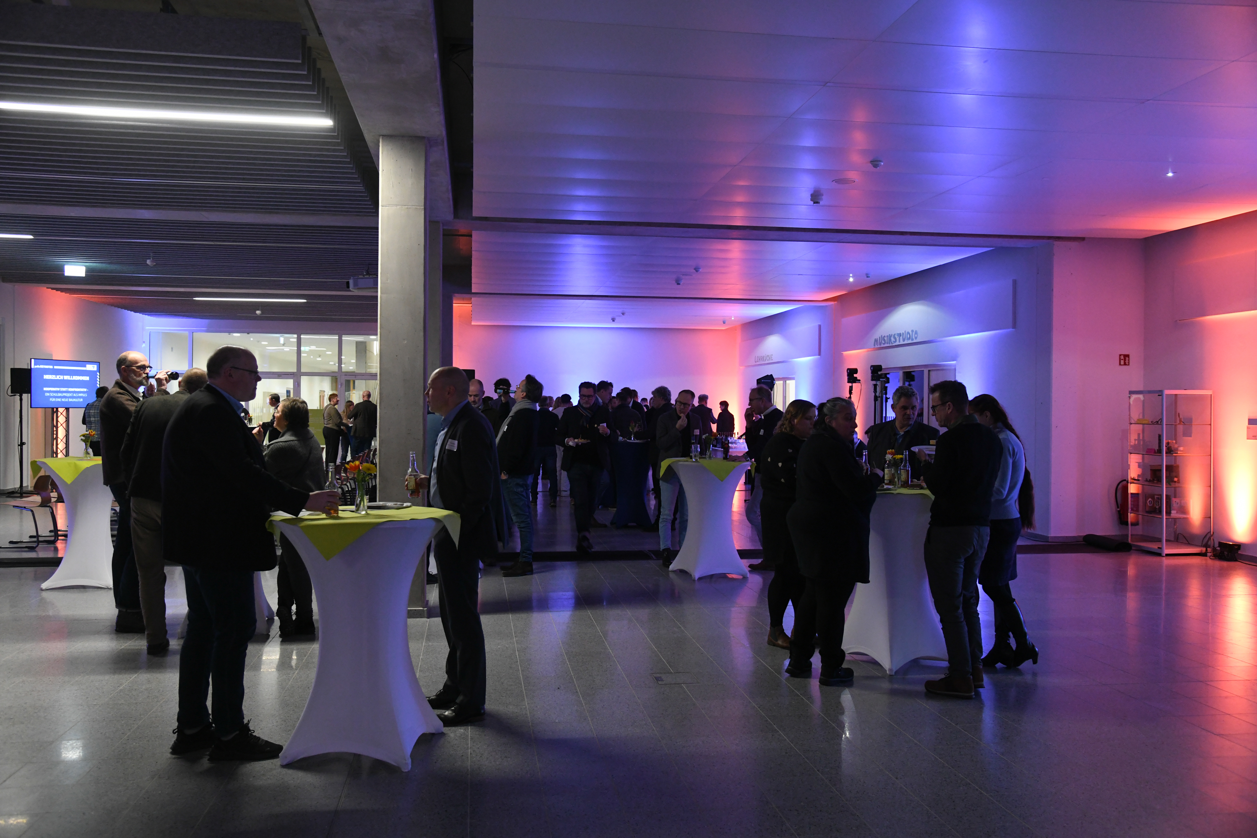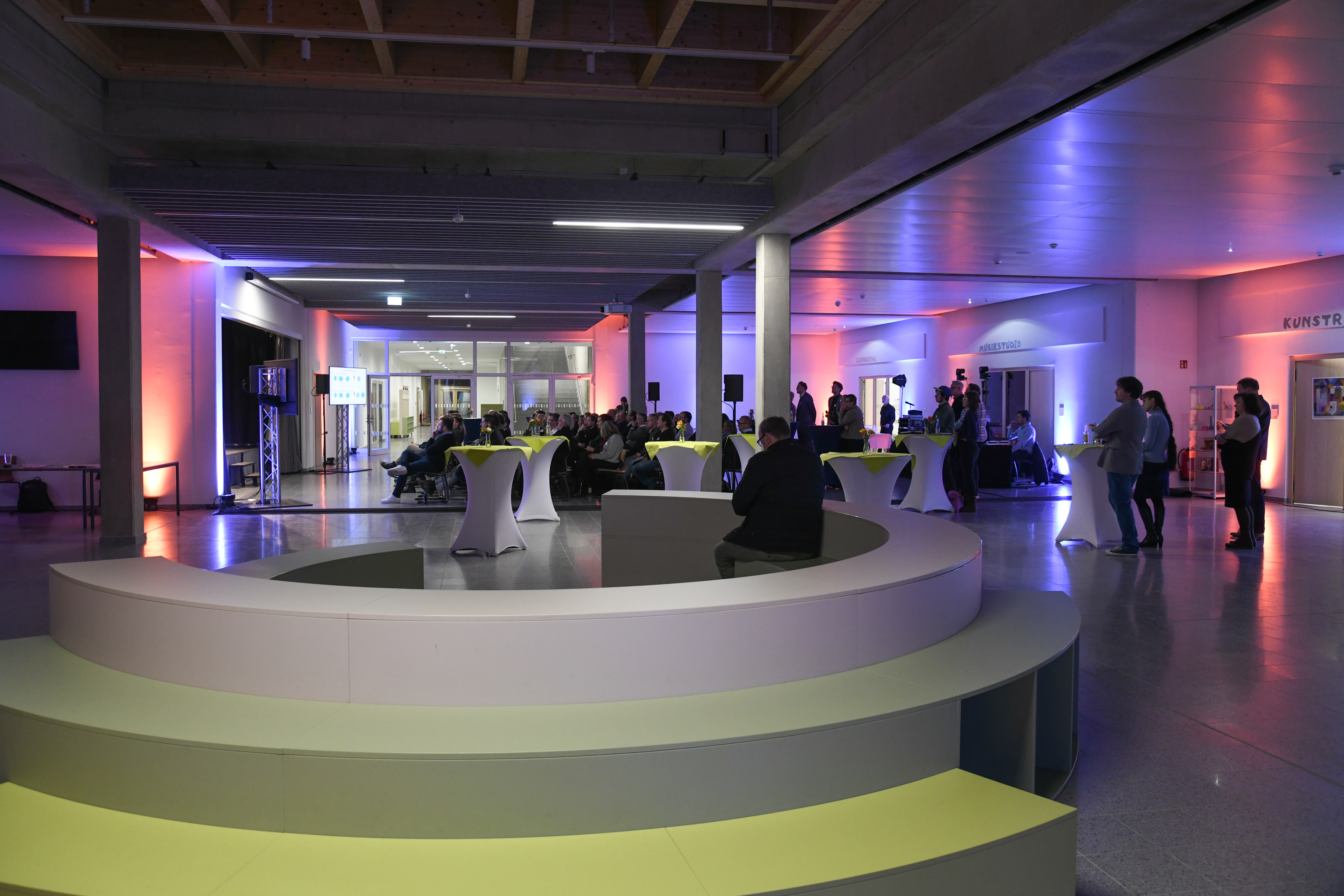 Dabei bot auch uns das Foyer der Oberschule den optimalen Raum zur Entfaltung für unsere polisKEYNOTES – auf einer integrierten Bühne und dem Catering direkt aus der Schulküche. Der Abend unter dem Titel „Kooperativ statt konfrontativ – Ein Schulbauprojekt als Impuls für eine neue Baukultur“ startete mit Führungen durch das Gebäude. Diese übernahmen die Lehrkräfte selbst und gaben den Gäst:innen aus Hannover, Bremen und der Bremerhaven und der Umgebung Bremerhavens dadurch authentische Einblicke in ihren innovativen Arbeitsort im Bremerhavener Stadtteil Lehe.