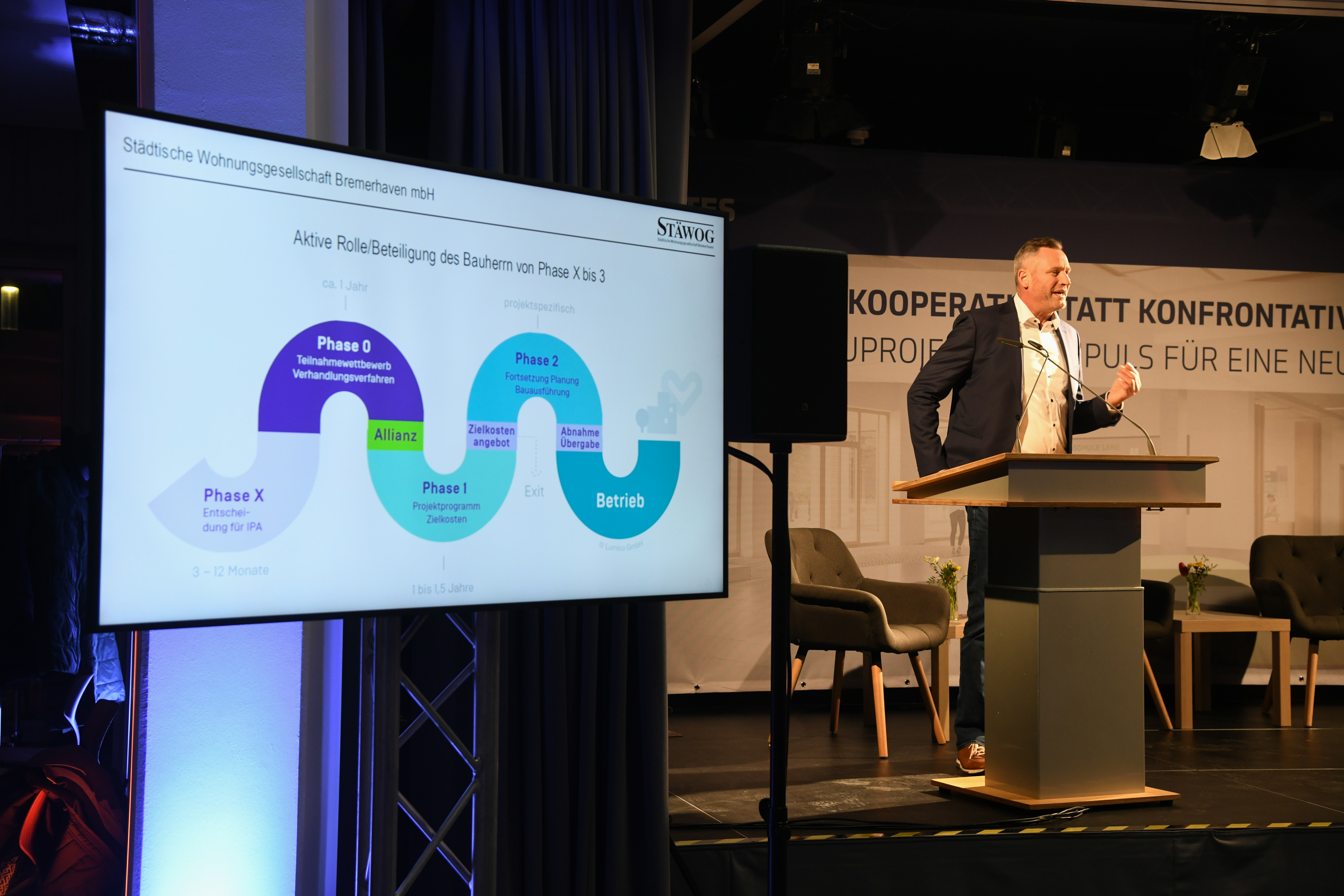 Die Vorträge eröffnete der Schulstadtrat Prof. Dr. Hauke Hilz. Er betonte, dass die Räume der drei Schulen die herausragende Arbeit von Kollegium und Schulleitung förderen und dringend benötigten Entfaltungsraum für die Schüler:innen bereitstellen. Anschließend begrüßte die Moderatorin Rieke-Marie Wilken die Gäst:innen – vor Ort und in der Live-Übertragung in der polisAKADEMIE. Sie führte in die Themen des Abends ein: „Es geht heute nicht nur um drei neue Schulgebäude – sondern um die Frage, wie wir künftig planen, bauen und zusammenarbeiten, wenn Komplexität steigt, Fachkräfte fehlen und gleichzeitig Zeit, Kosten und Qualität unter Druck stehen.“ Die Allianz 3 Schulen Bremerhaven setzt auf die Methodik der Integrierten Projektabwicklung (IPA) – eine Organisationsform, die nicht nur Prozesse beschleunigt, sondern vor allem die Haltung im Projekt verändert. Neben der Einhaltung der Kosten- und Terminrahmen, hinterlässt die Allianz mehr als 300 begeisterte Projektbeteiligte bei der STÄWOG-Gruppe, bei der BIS Wirtschaftsförderung, bei den fünf weiteren Projektpartner:innen sowie beim Schulamt Bremerhaven und den Schulen.