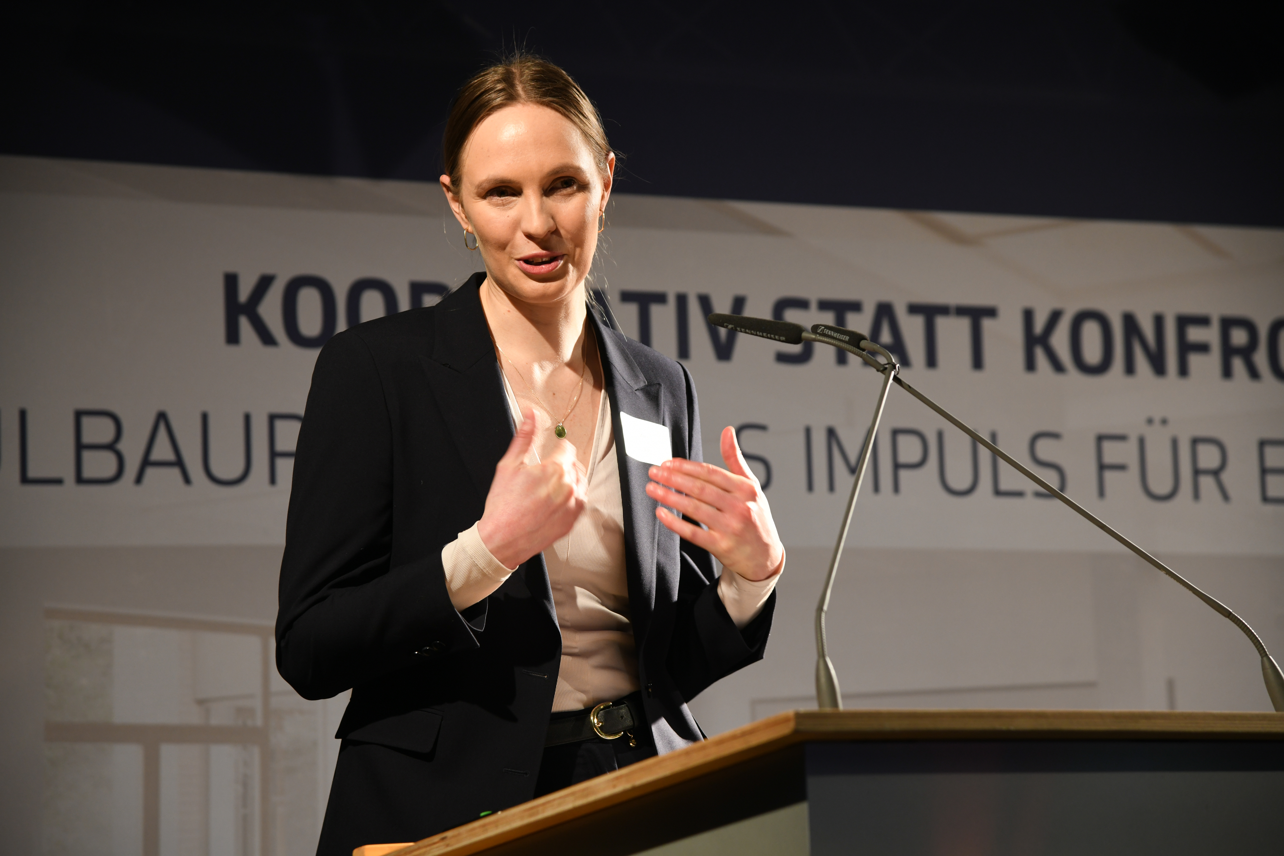 Dass diese Form des gemeinsamen Arbeitens Verbindlichkeit braucht, machte Kai Hamel, Projektmanager bei der STÄWOG Bremerhaven deutlich: Ein IPA-Projekt sei „wie ein Schiff – man kann nicht mitten auf der Fahrt einfach aussteigen.“ Genau diese Haltung habe Rollen und Verantwortlichkeiten im Projekt geprägt und verändert. Dieses „Unternehmen auf Zeit“ arbeitete in der gesamten Projektphase – vom Beginn der Planungsphase Anfang 2022 über den Beginn der Bauarbeiten im Frühjahr 2023 bis zur Schlüsselübergabe pünktlich zum neuen Schuljahr 2025/26 – in einer gemeinsamen Co-Location eng zusammen. Sein Fazit: „Wer Fehler zugibt, kann nur daraus lernen – gemeinsam.“ Für Anna Bade, Consultant IPA und Lean bei lumico, bedeutet die Zusammenarbeit in einer IPA ganz konkret, dass „Planer:innen und Architekt:innen durch die Projektstruktur wieder befähigt werden, im Projektmanagement mitzuwirken.“ Durch Anreizsysteme – wie Vergütung auf Basis erstattbarer Kosten, gemeinsame Verantwortung und Risikotragung, integrale Teams und Transparenz, kollaborative Anwendungen von Lean und BIM sowie konsequente Organisationsstrukturen – teilen sich alle IPA-Beteiligten die Risiken gemeinsam. Die Grundsätze „best for the job“ und „best for the project“ unterstützen bei der Bildung von Fachteams bzw. Aufgabenteams, die sich aus Mitarbeitenden der beteiligten Unternehmen usammensetzen. Dazu gehören die PITs als Wissensträger in ihren Bereichen, die PMTs durch moderierende Führung als Hüter der Ziele, Kulturgestalter und Vorbilder für Kommunikation und die SMTs als Geschäftsführende und Unterstützende. Sie resümierte: „Ich bin sehr beeindruckt von dieser Zuversicht und Veränderung die sich ergibt durch IPA und Struktur.“