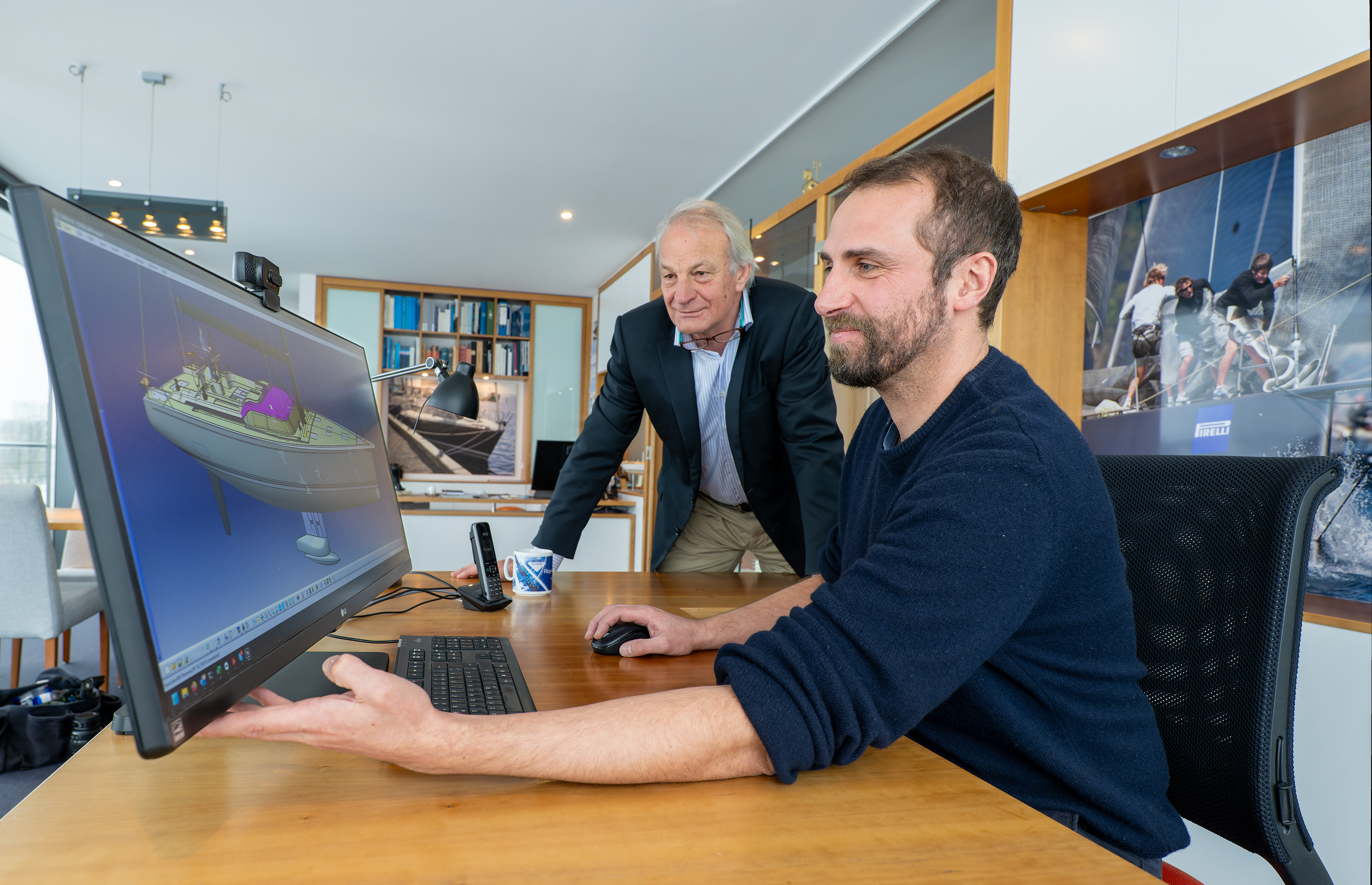 Die Evolution des Yachtbaus ist an einer Wand des Bürogebäudes in einer Vielzahl von Halbmodellen der Rumpfformen dokumentiert. Nicht nur die äußeren Linien – der sogenannte Riss – der Boote und ihre Größe haben sich verändert. Auch die Materialien und Produktionsverfahren für ihren Bau sind längst Hightech-Anwendungen aus Carbonfasern und anderen ultraleichten Werkstoffen, wie sie beim hochmodernen Flugzeugbau verwendet werden. Auch die Arbeitsmethoden und Werkzeuge der Ingenieure und Designerinnen und Designer haben sich grundlegend gewandelt. „Als ich anfing, hatten wir noch Zeichentische und Kurvenlineale“, erinnert sich Torsten Conradi, „du kennst das gar nicht mehr, oder?“, wendet er sich an seinen Kollegen.